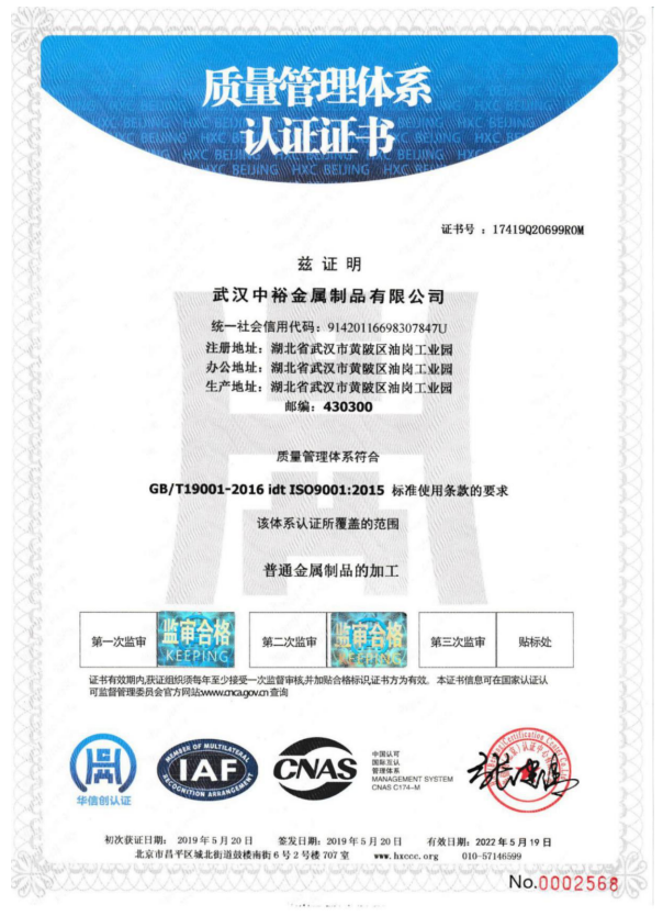 武漢中裕金屬制品有限公司(以下簡稱公司)成立于1996年8月,民營私人獨資企業。2010年8月投資1800余萬元,在前川油崗工業園征地20畝,新建5000平方米的生產車間和1100平方米的辦公大樓,2011年8月全部峻工投入使用。